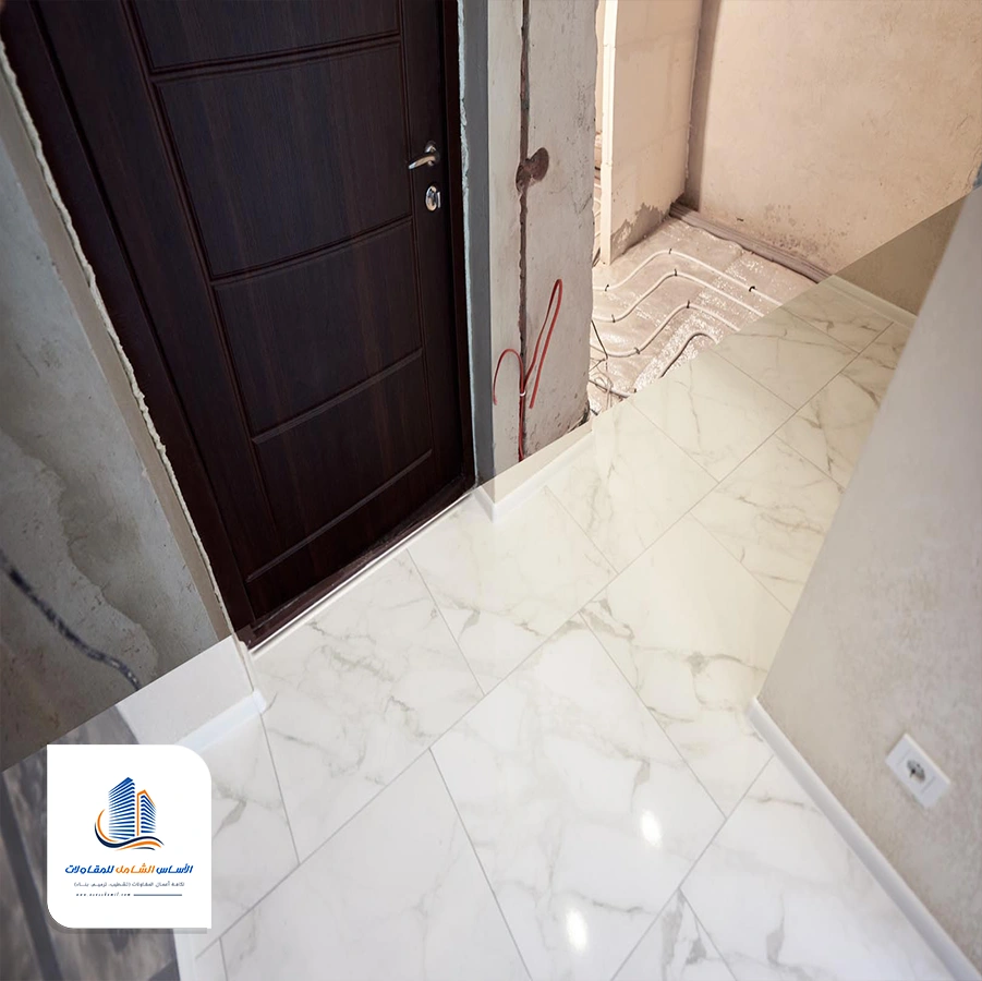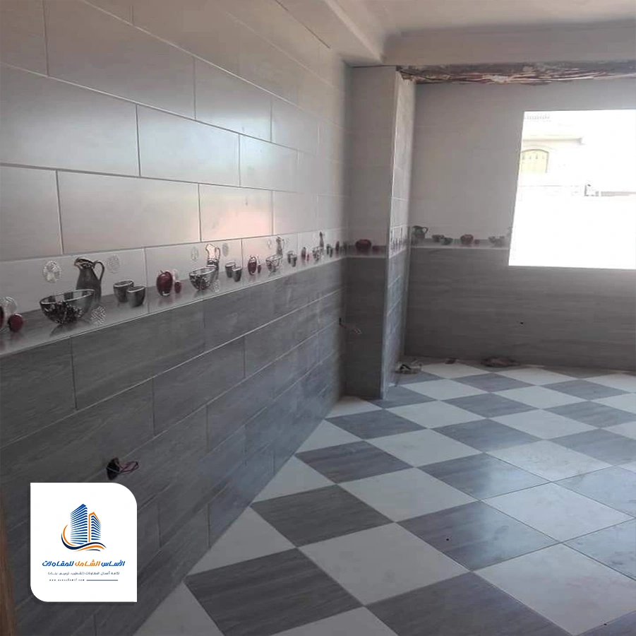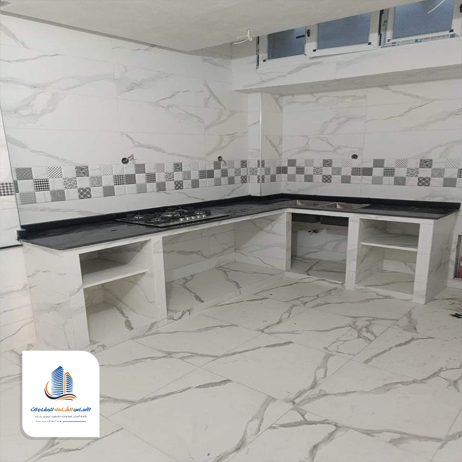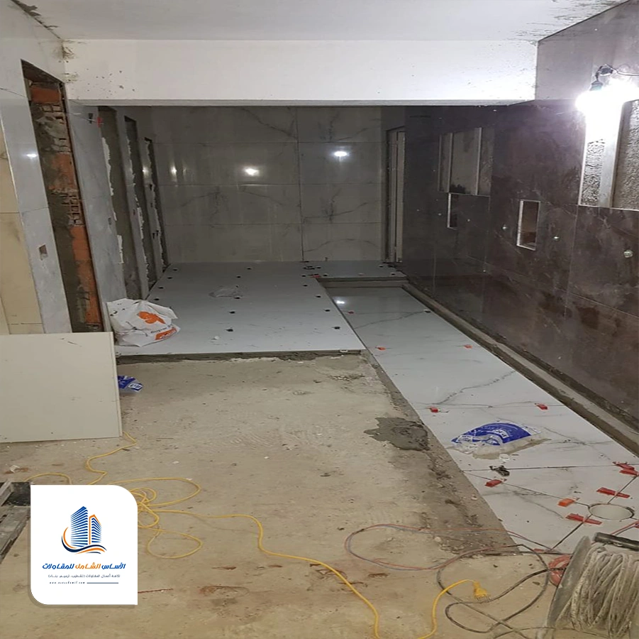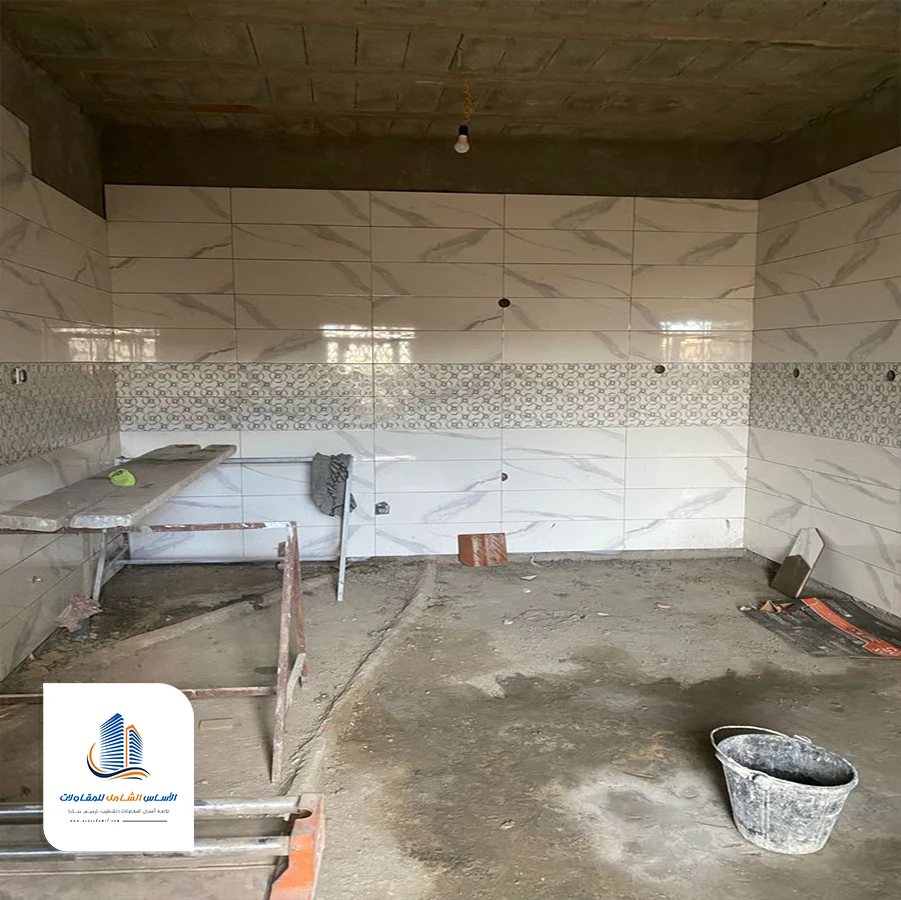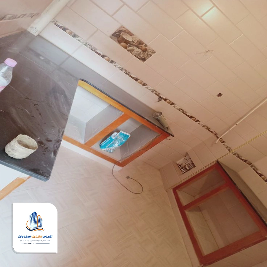 يتم إصلاح الارضيات وتركيب السيراميك بعدها يتم تركيب الخزائن.